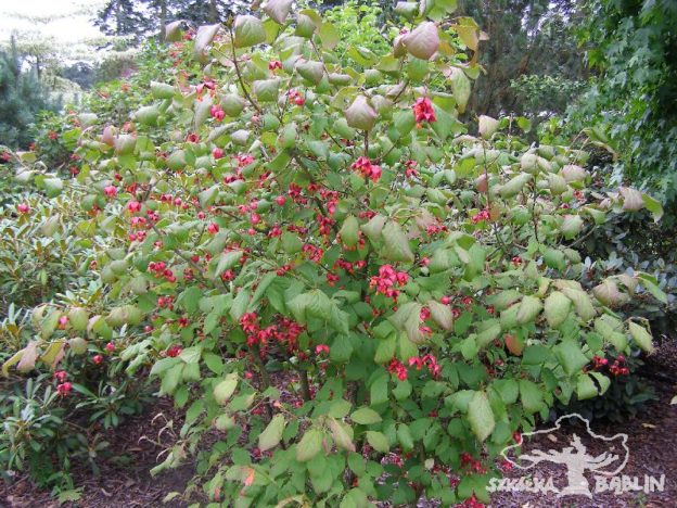 Duży krzew o wysokości do 5 – 7 m i szeroki. W młodości rośnie dość wolno, ale później tempo wzrostu przyspiesza. Posiada duże, eliptyczne liście, które wiosną pojawiają się wcześniej niż u innych gatunków trzmielin. Liście mają barwę ciemnozieloną, a jesienią przebarwiają się na piękny czerwony kolor. Krzew ten kwitnie w V zielono – żółtymi kwiatami zebranymi w kwiatostany, które nie mają większego znaczenia zdobniczego, ale za to owoce, które powstają z tych kwiatów są bardzo dekoracyjne. Owoce dojrzewają dość wcześnie w VIII – IX, mają kształt czterokomorowej torebki w pięknej karminowoczerwonej barwie. Zebrane są w gęste, zwisające owocostany. Podczas dojrzewania torebki pękają i wówczas pojawiają się okryte pomarańczowymi osnówkami nasiona. Krzew w tym czasie stanowi wyjątkową barwną ozdobę ogrodu, tym bardziej, że krótko po owocostanach spektakularnie przebarwiają się na czerwono liście. Roślina ta nie ma dużych wymagań. Dobrze rośnie na każdej przeciętnej, przepuszczalnej glebie ogrodowej o odczynie lekko kwaśnym do obojętnego. Nie lubi gleb zbyt wilgotnych. Stanowisko słoneczne lub półcień. Dobrze rośnie też w cieniu, ale słabo wówczas owocuje. Na mróz całkowicie odporny i można go bez obaw sadzić w całym kraju. Krzew ten pochodzi z Dalekiego Wschodu i w naturze występuje w Korei, Japonii i Mandżurii. Rzadko spotykany w polskich ogrodach i ze względu na wytrzymałość i walory zdobnicze godny szerszego rozpowszechnienia.